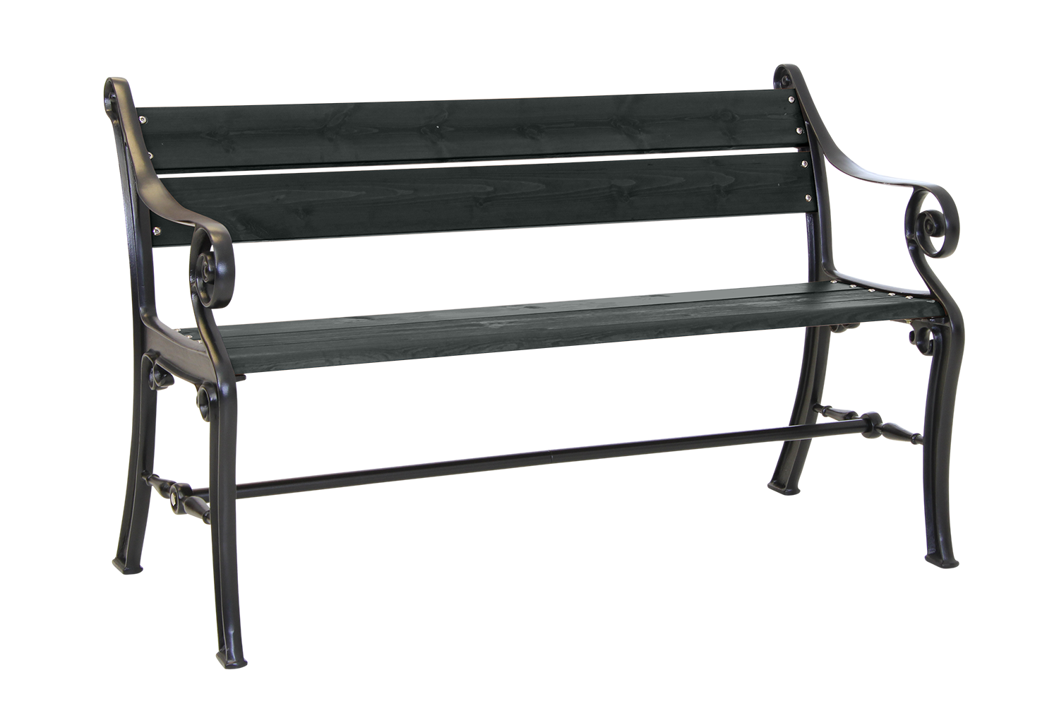 Banc de jardin classique avec des extrémités décoratives en aluminium coulé peint en noir, combiné avec un beau pin imprégné brun pour l’assise.