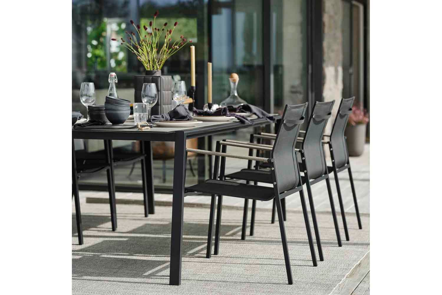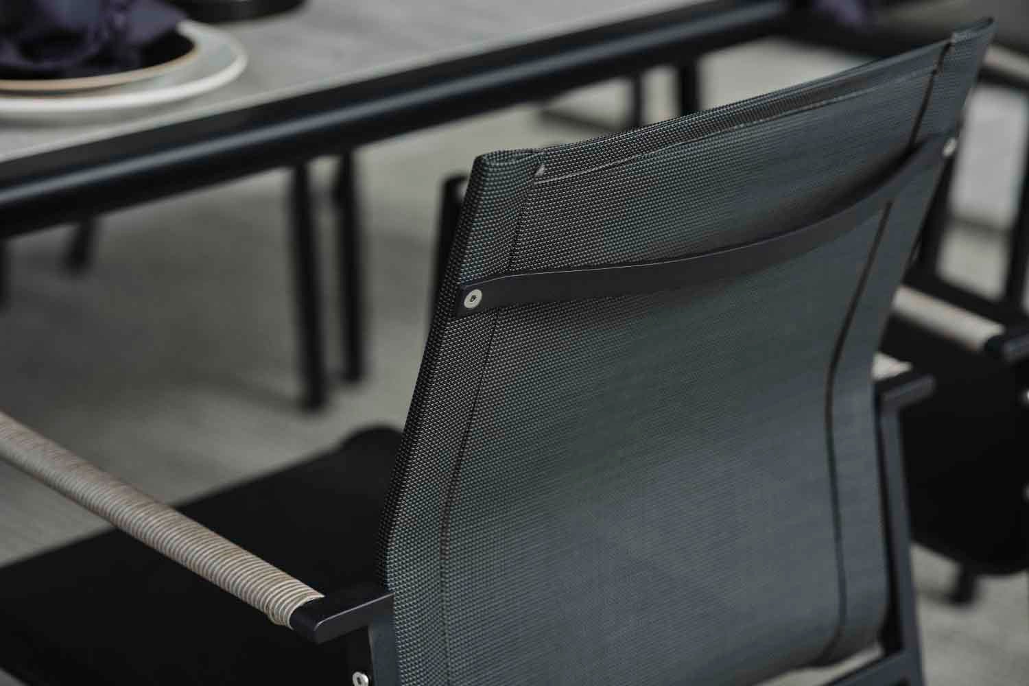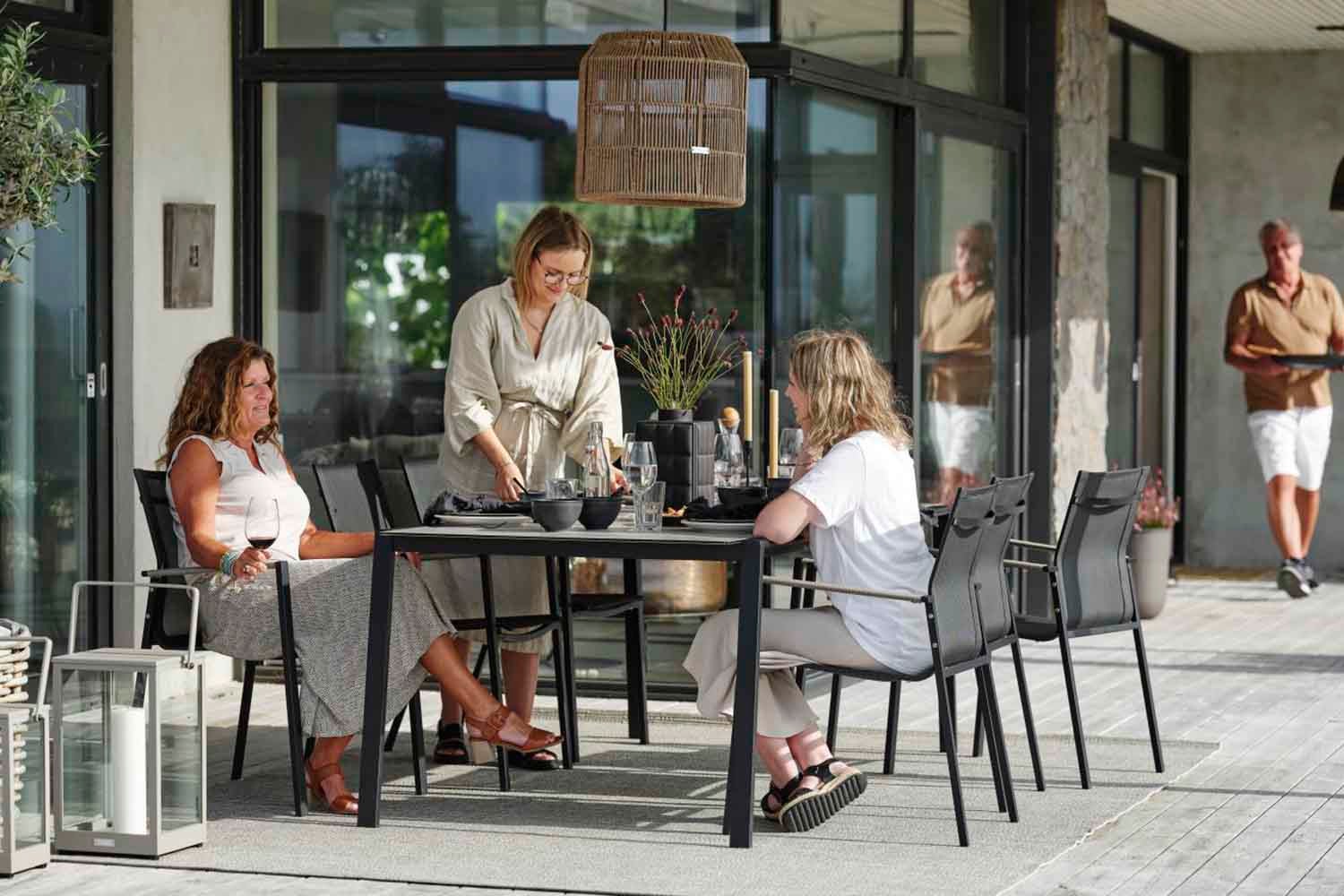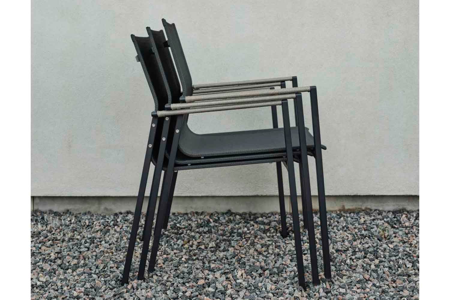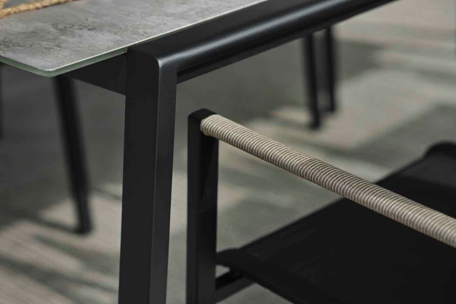 Lyra est une série moderne et très élégante dans un délicieux mélange de matériaux. Le cadre est en acier inoxydable (304) enduit de poudre noire, parfait pour résister à diverses conditions météorologiques. De beaux détails en rotin artificiel sur les accoudoirs.