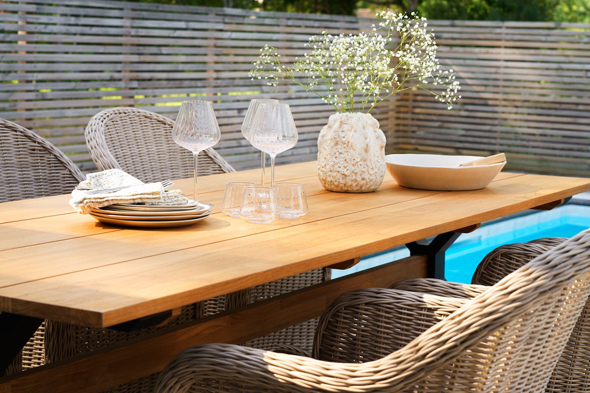 Mark est une table à manger où la chaleur rustique rencontre l’aspect industriel. Le plateau en teck massif est associé à des pieds croisés en aluminium et crée un puissant mélange de naturel et de moderne. Les pieds réglables assurent la stabilité même sur des surfaces inégales.
