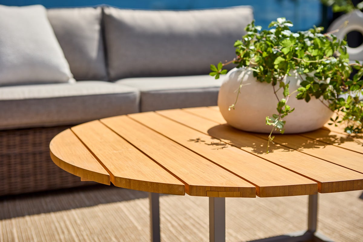 Forme naturelle. Une présence constante. Olive est une table ludique et élégante, nommée d’après les olives qui ont inspiré sa forme. Le cadre en aluminium et le dessus en bambou ou en aluminium allient fonction et design. Les pieds réglables assurent la stabilité sur toutes les surfaces. Olive s’adapte à la plupart des groupes de canapés et est également élégant à combiner avec des tables basses telles que Mill ou Peace Lounge.