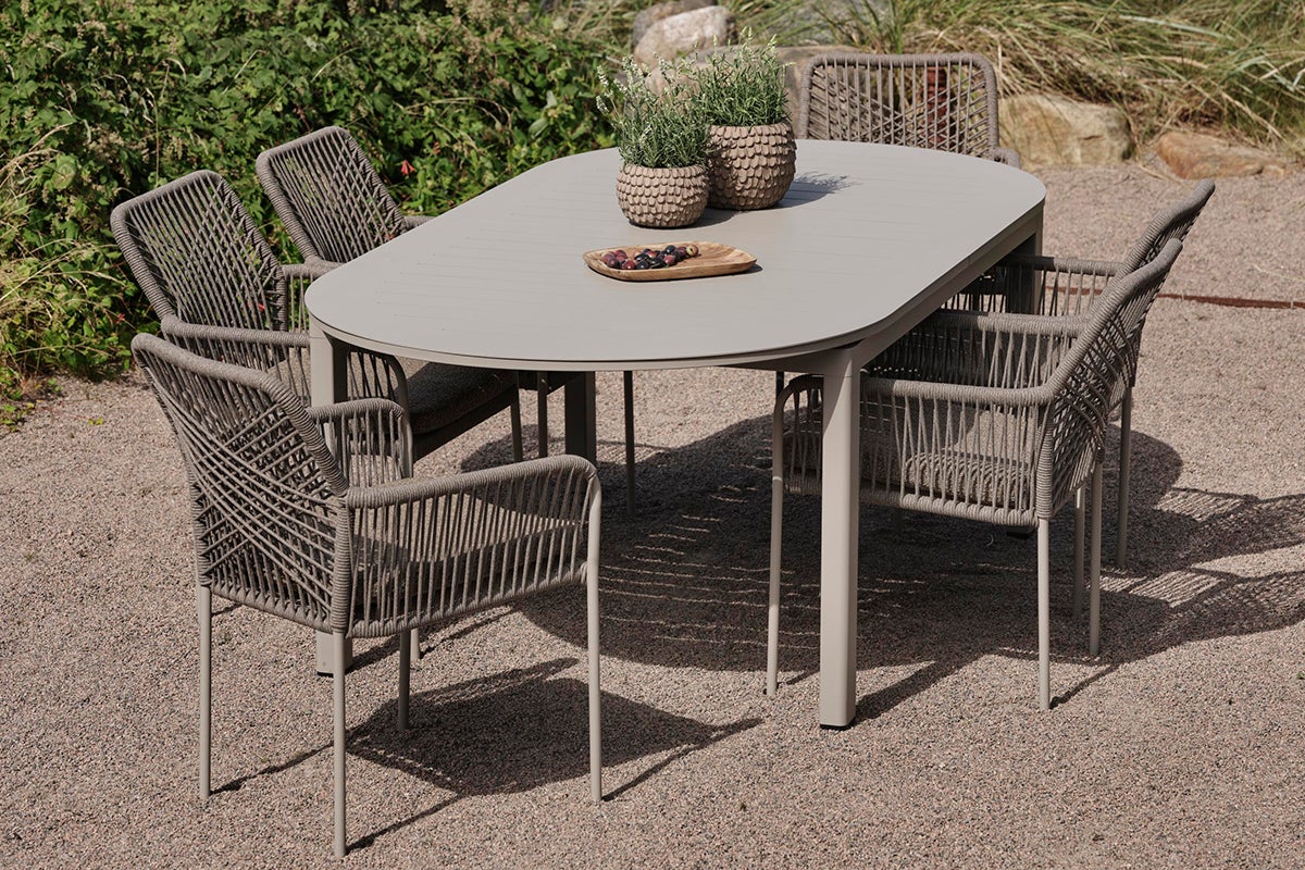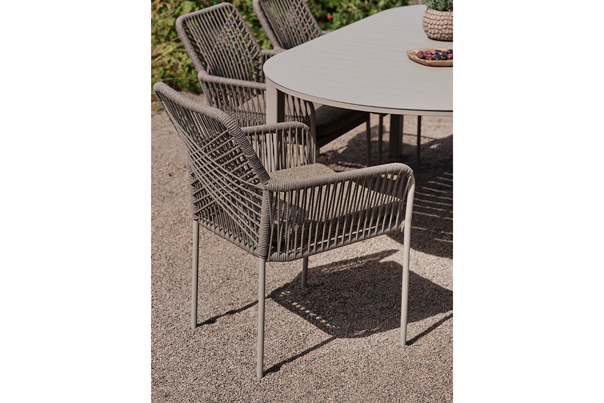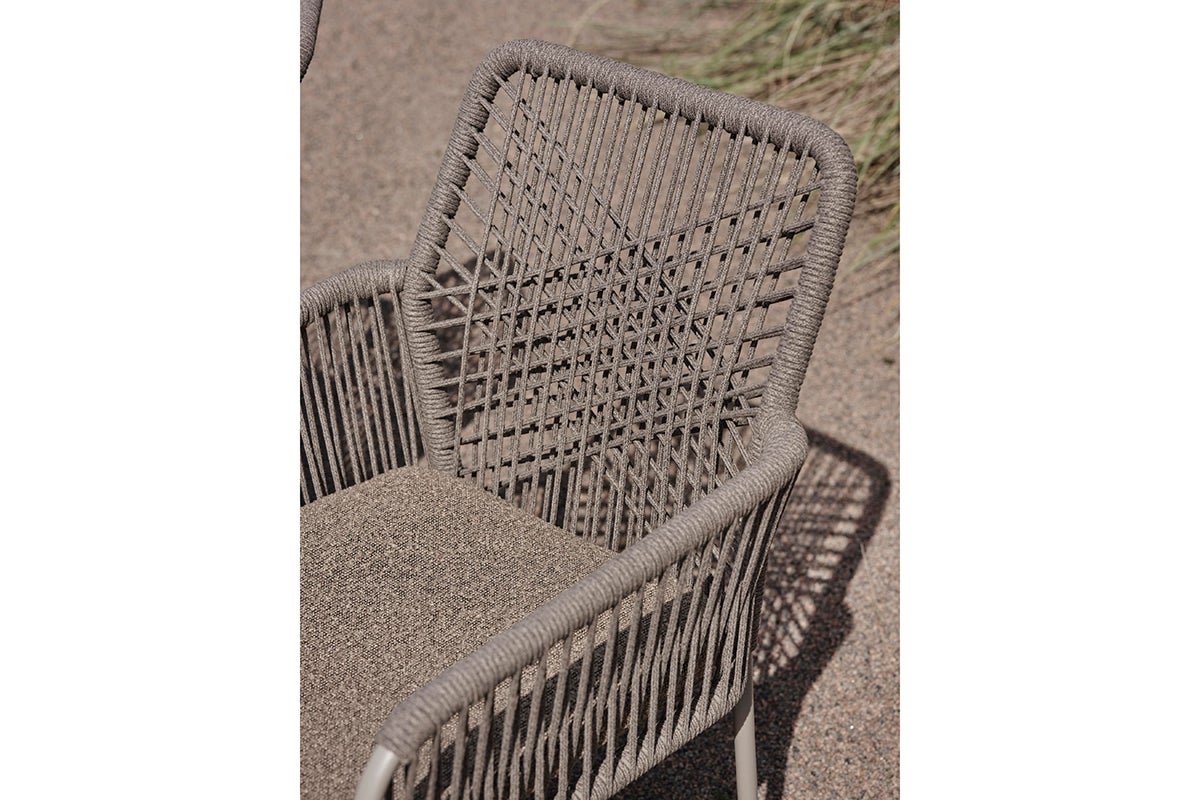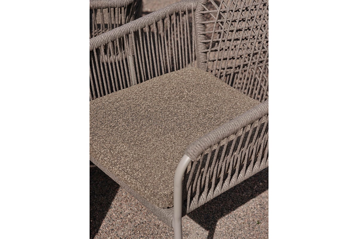 Cette chaise de salle à manger confortable présente un design en corde tressée qui résiste aux intempéries. Le cadre en acier offre un soutien stable tout en résistant à la rouille et à la corrosion, assurant une utilisation durable dans tous les climats. Le motif joliment tressé du siège et du dossier donne une sensation organique renforcée par ses tons terreux, vous invitant à la détente. Un coussin de siège est inclus pour plus de confort.