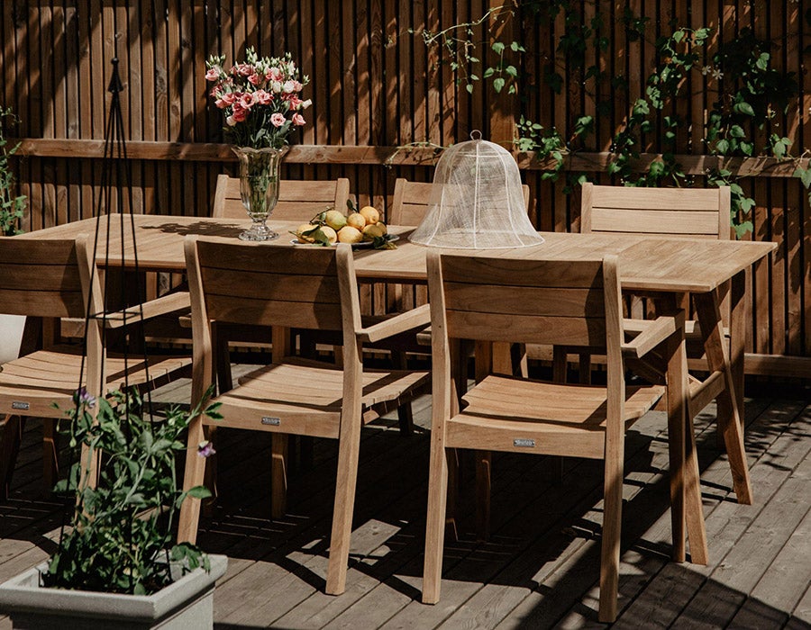 Les meubles doivent évidemment résister aux intempéries. Comme le mobilier d'extérieur est typiquement quelque chose que l'on garde longtemps, j'aime investir dans des meubles de bonne qualité. Nous avons un ensemble en teck de chez Brafab à la maison, qui est devenu de plus en plus beau au fil des années. Par conséquent, lorsque vous choisissez des meubles d'extérieur, optez pour quelque chose de beau et confortable, et ne vous préoccupez pas trop de la tendance.