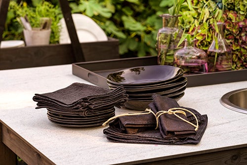 Bellac en aluminium verni avec un plan de travail en granit vous ouvre des possibilités inattendues pour aménager votre cuisine extérieure exactement comme vous la souhaitez. Avec les parties séparées d’angles, de plans de travail et d’évier, vous pouvez créer la variante qui convient exactement à vos besoins. Grâce aux pieds repositionnables, la cuisine reste stable, même si la surface n’est pas droite. Existe en réalisation blanche ou noire.