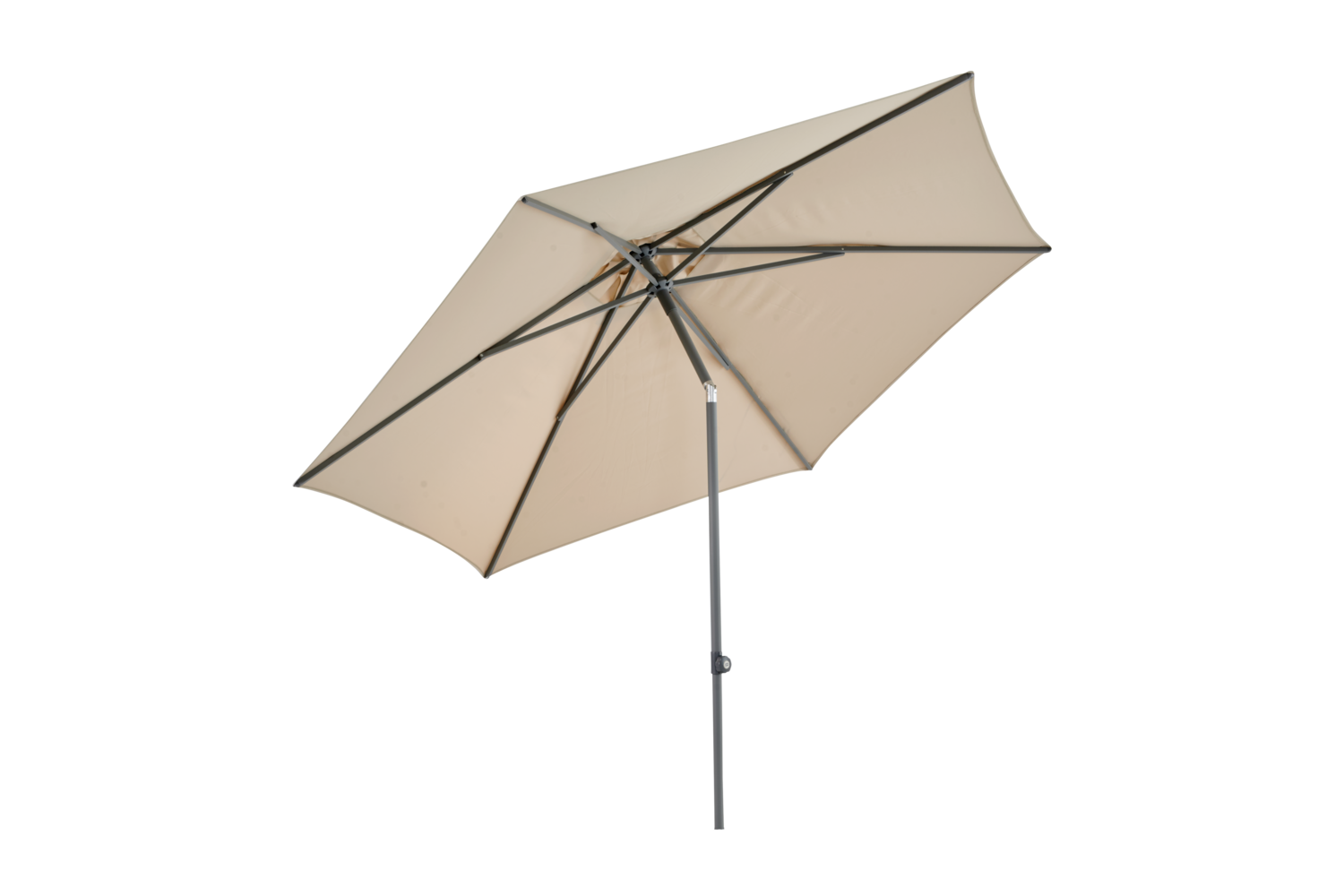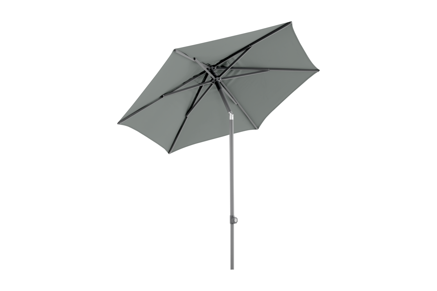 Le parasol Poppi dispose d'un mât en aluminium laqué anthracite en deux parties, d’un diamètre de 38 mm. Il est équipé d'une fonction d'inclinaison avec bouton-poussoir pour faciliter l’angle, la montée et la descente. L'ouverture du parasol est simple grâce à la poignée push-up, qui déploie en douceur la toile avec un petit "pop" à la fin. La toile est fabriquée en tissu teint dans la masse de 250 g, avec un orifice de ventilation, et est soutenue par 5 baleines en aluminium.