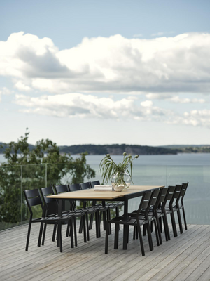 Une luxueuse table à manger qui impose vraiment et prolonge la maison vers l’extérieur. Les jolies lattes en teck sont renforcées par les pieds droits en acier. Et pour les grands repas, les rallonges dissimulées peuvent être dépliées en forme papillon. Dépliée, la table mesure 3,2 mètres.